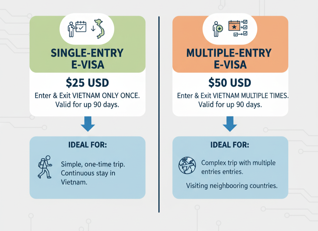 When you apply for a Vietnam e-visa, you will have the option to choose between a single-entry visa and a multiple-entry visa. Understanding the difference between these two types of visas is crucial for choosing the right one for your trip. This guide will help you make an informed decision.