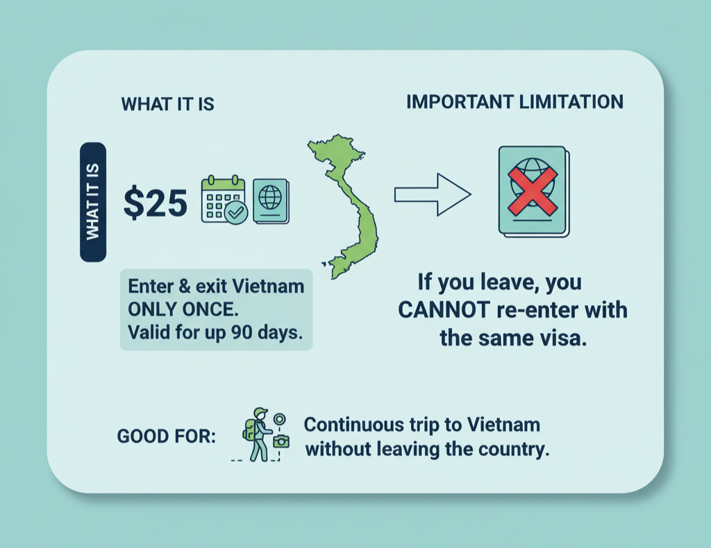 A single-entry e-visa allows you to enter and exit Vietnam only once. If you leave Vietnam, you will not be able to re-enter the country with the same visa, even if it is still valid. A single-entry e-visa is a good option if you are planning a continuous trip to Vietnam and do not intend to leave the country and re-enter.