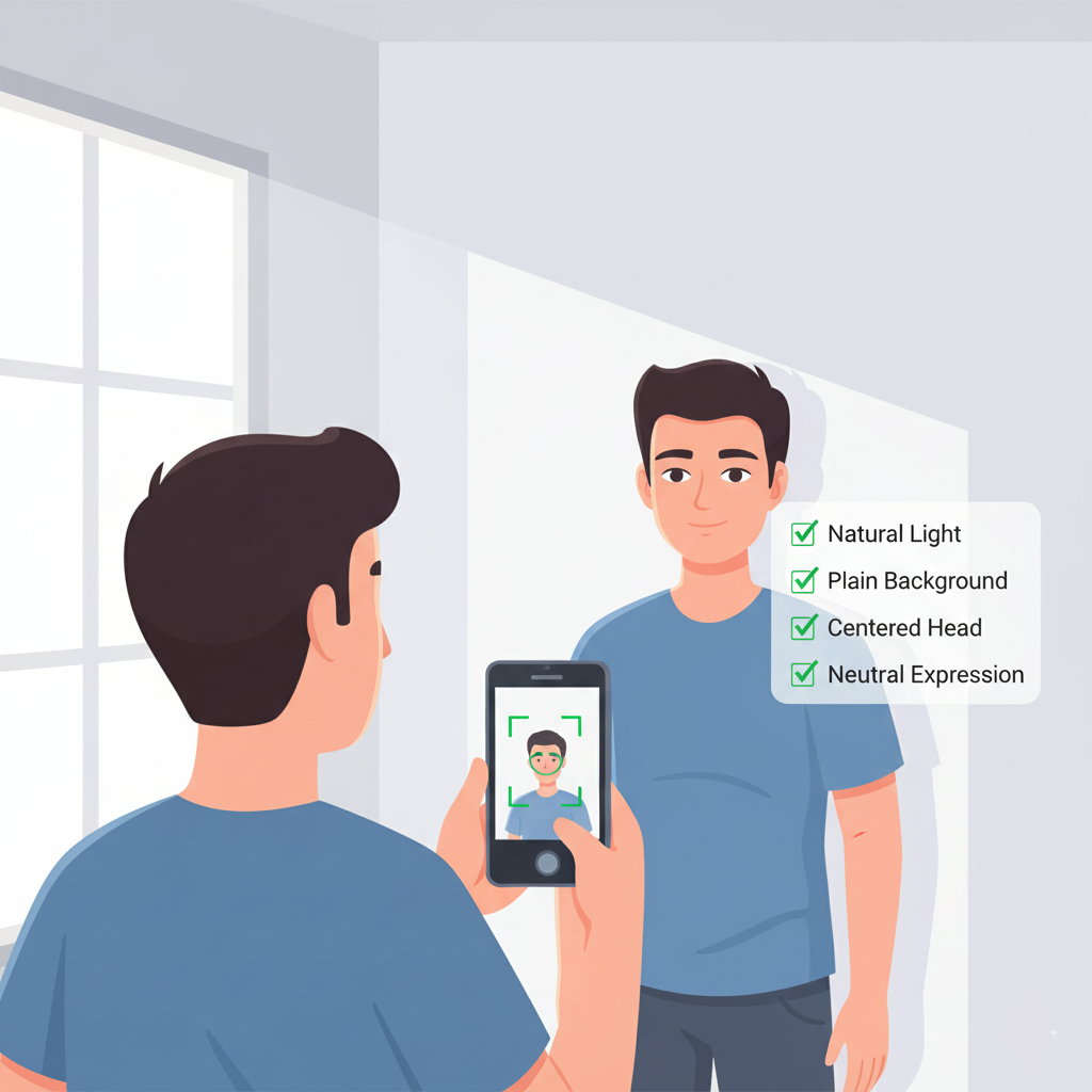 Ask someone to take the photo for you: This will help you ensure that your head is centered and that you have a neutral facial expression.